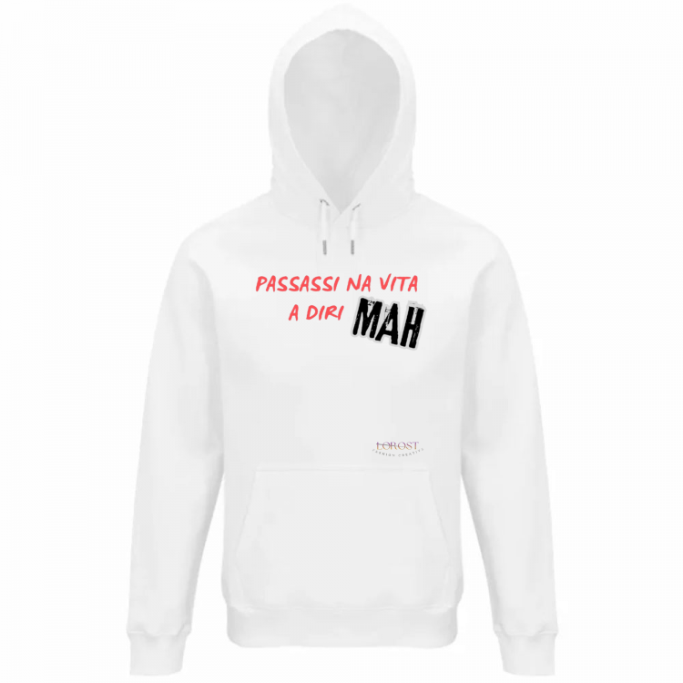 Durable combination of ring-spun cotton and polyester. Unisex hoodie with scraped interior, jersey lined hood and elastic ribbed hem at the waist and at the end of the sleeves. Lanyards with eyelets and metal stoppers. Composed of 80% cotton from organic farming and 20% recycled polyester. Washable at 30 degrees.